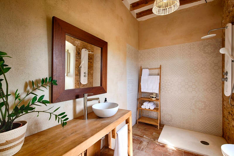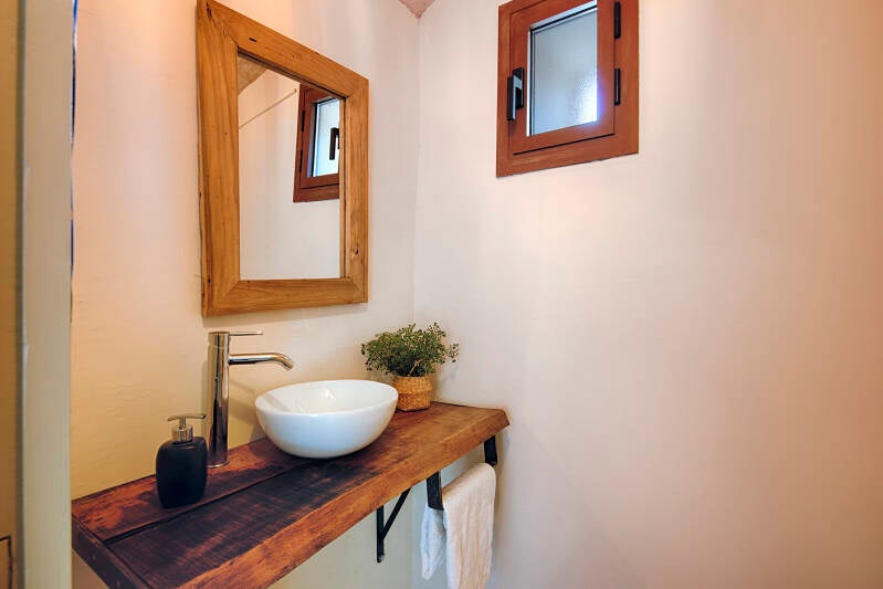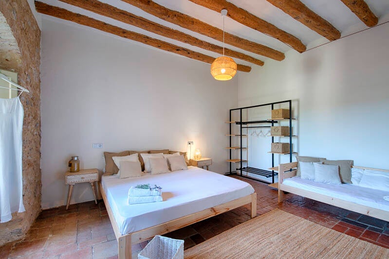 En la primera planta encontramos cuatro habitaciones: dos habitaciones con cama doble XL y dos habitaciones triples con cama doble XL y cama individual. Todas ellas con vestidor abierto y juego de sabanas y toallas. Una de las habitaciones dobles tiene baño privado con plato de ducha, el resto de habitaciones comparten baño espacioso con doble pica y plato de ducha .